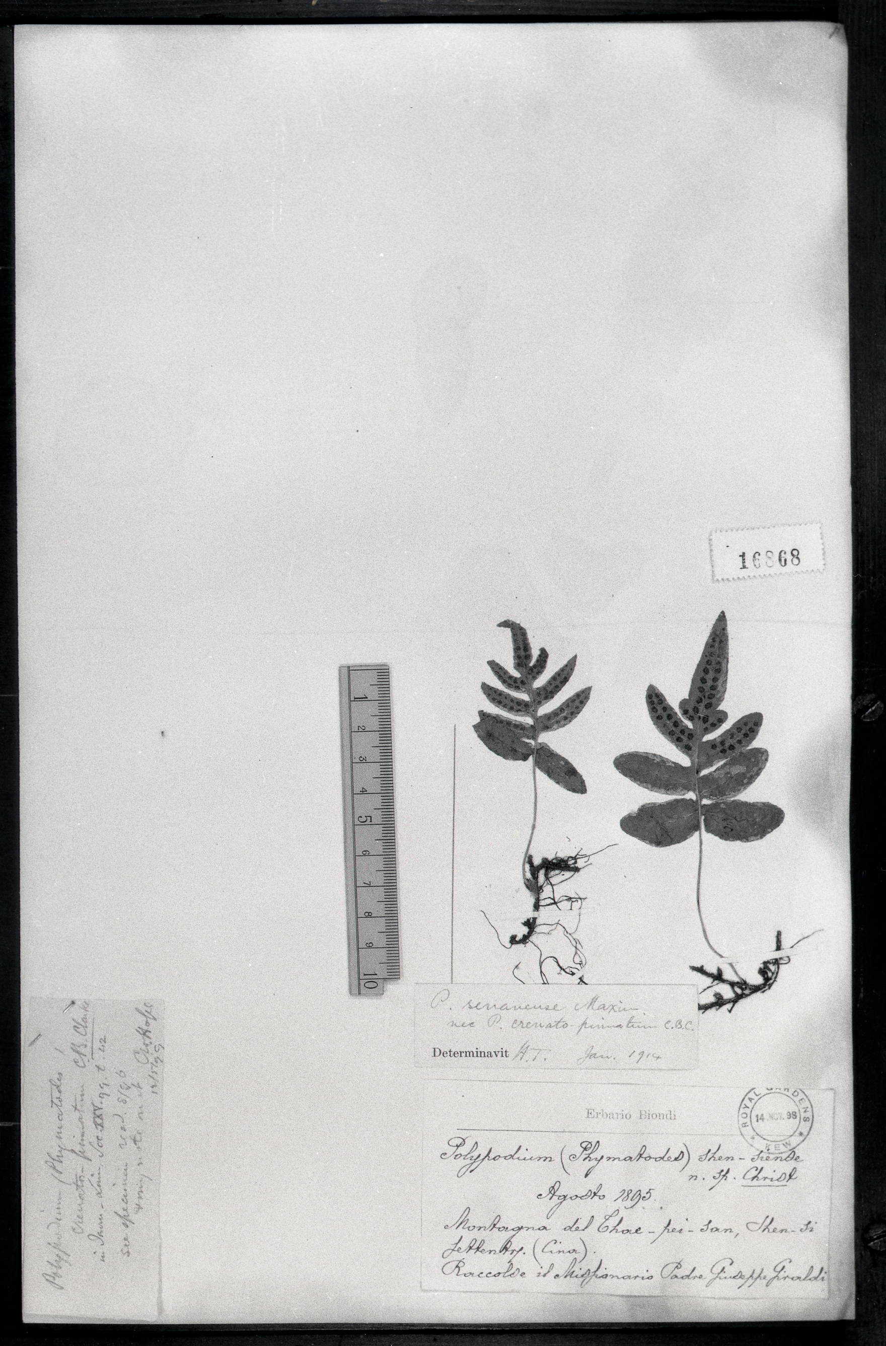 | 照片编号 | 16868 | | 学名 | Phymatodes shensiensis (Christ)Ching (Polypodium shensiensis Christ) | | 中文名 | | | 科名 | 水龙骨科 Polypodiaceae | | 属名 | 密网蕨属 | | 保存馆 | KEW | | 标本号 | 16868 | | 采集人 | | | 采集号 | | | 采集省份 | | | 采集地 | | | 采集日期 | | | 备注 | |