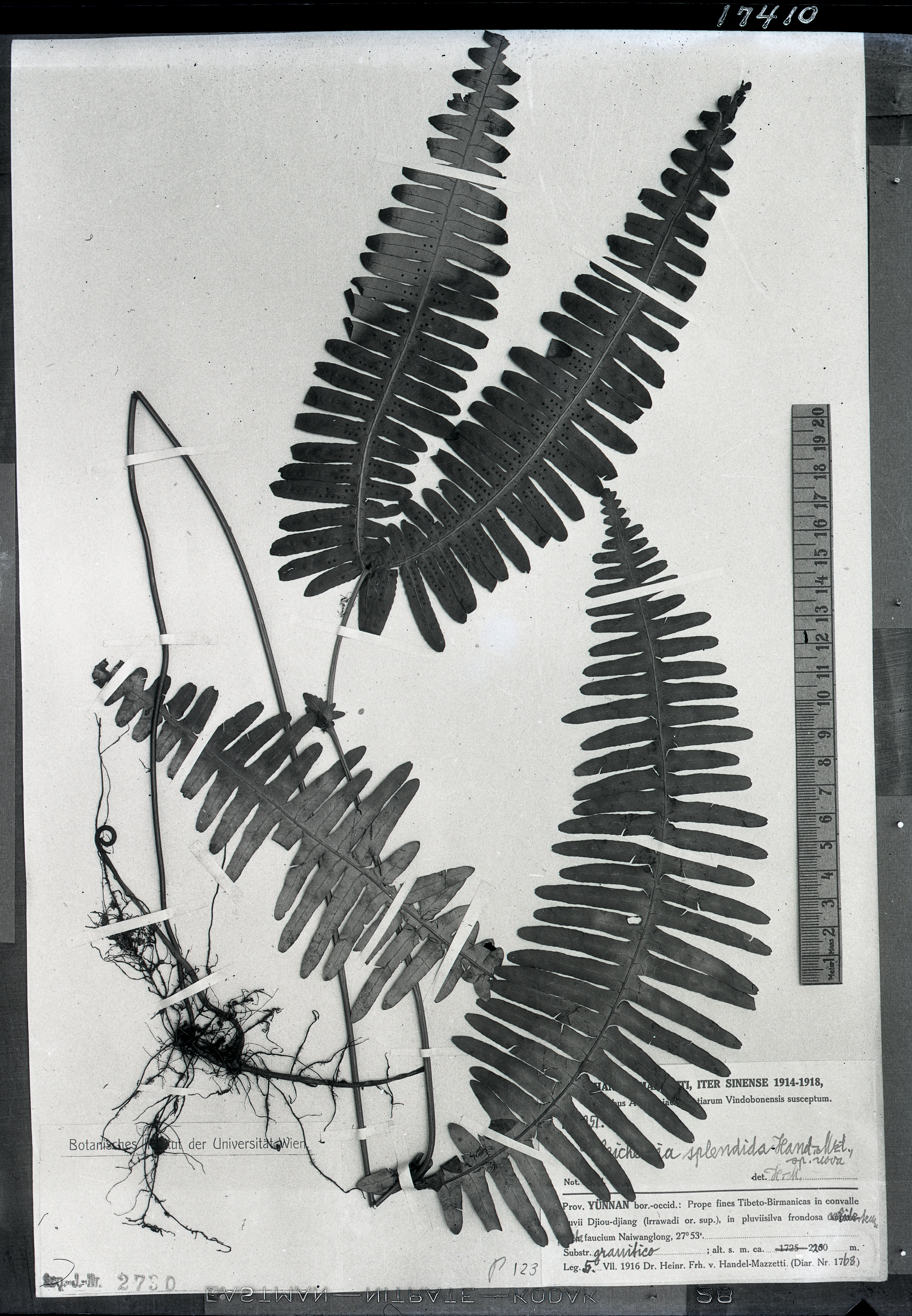 | 照片编号 | 17410 | | 学名 | Dicranopteris splendida (H.M.)Tagawa (Gleichenia splendida H.M.) | | 中文名 | | | 科名 | 里白科 Gleicheniaceae | | 属名 | 芒萁属 | | 保存馆 | KEW | | 标本号 | 17410 | | 采集人 | | | 采集号 | | | 采集省份 | | | 采集地 | | | 采集日期 | | | 备注 | |