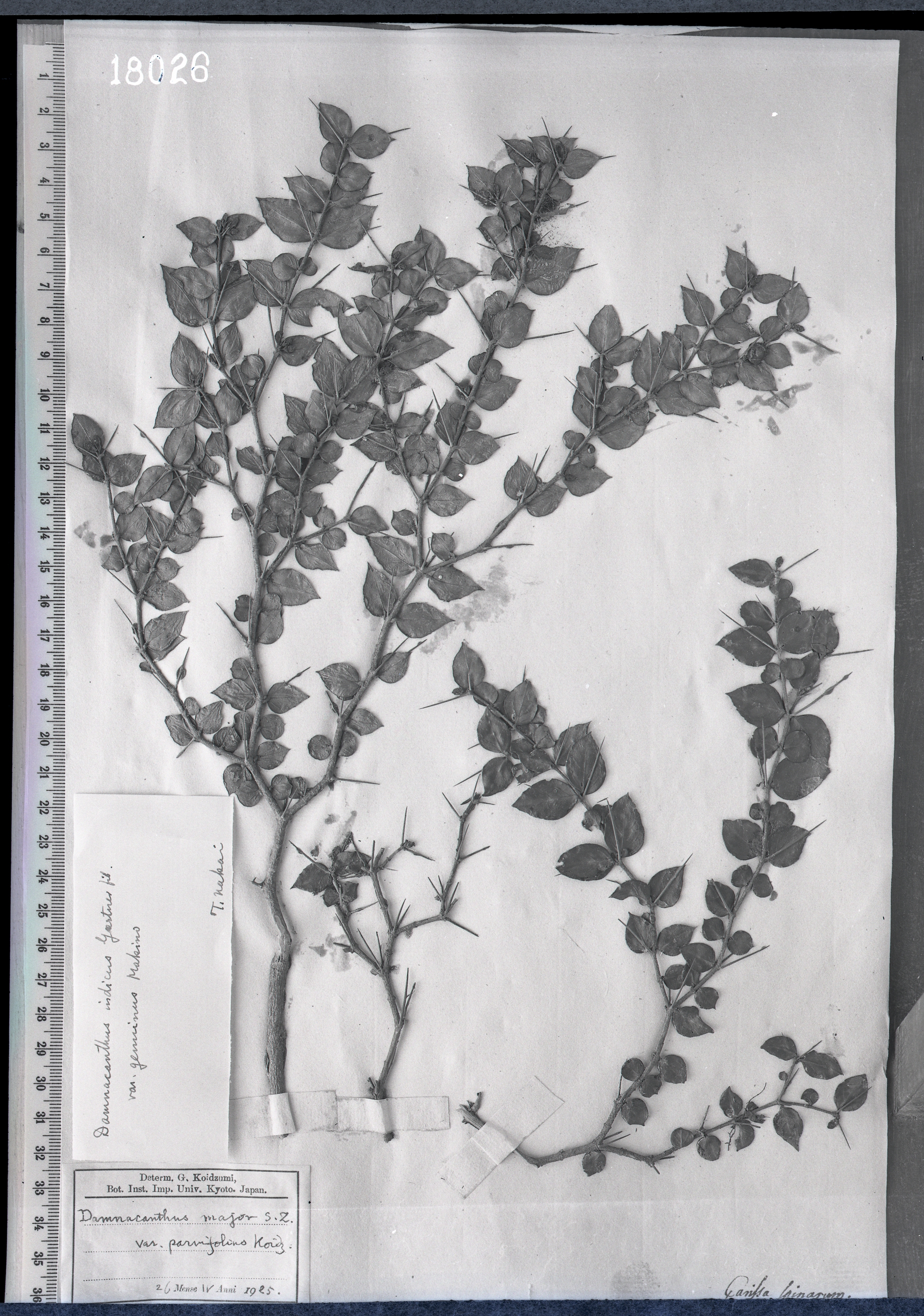 | 照片编号 | 18026 | | 学名 | Carissa spinarum Thunb. (Damnacanthus major S. et Z. var.parvifolius Koidz.) | | 中文名 | | | 科名 | 夹竹桃科 Apocynaceae | | 属名 | 假虎刺属 | | 保存馆 | KEW | | 标本号 | 18026 | | 采集人 | | | 采集号 | | | 采集省份 | | | 采集地 | | | 采集日期 | | | 备注 | |