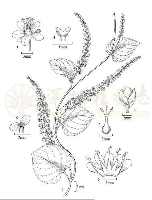 图 582 落葵薯 Anredera cordifolia 1. 分枝的一段,示叶和花序; 2. 花蕾; 3. 花; 4. 花基部下面的一对小苞片;