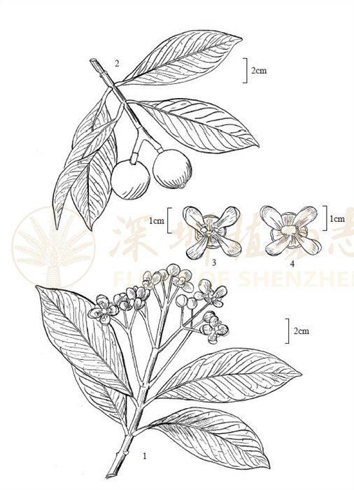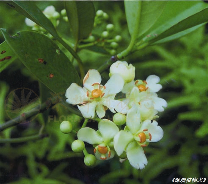 常绿乔木,稀灌木。株高(3—)5—12(—15)m,胸径20—40cm;树皮灰白色,粗糙,有黄色的树脂液;小枝亮绿色,具槽纹,光滑。叶对生;叶柄长0.6—1.2cm;叶片厚革质,卵形或长圆状卵形至长圆状倒卵形,长7—15(—20)cm,宽2—6(—8)cm,基部楔形或宽楔形,边缘全缘,反卷,先端短渐尖或急尖,两面无毛,下面苍绿色或干时褐色,中脉在下面凸起,在上面下陷,侧脉每边10—15条,纤细,斜升至近叶缘处网结,不达叶缘。花雌雄同株;雄花:直径2—3cm,有时单生,有时组成聚伞圆锥花序,花序长5—7cm;花梗长0.8—1.5cm;萼片4,外面2片较小,长和宽均为6—7.5mm,内面2片较大,长0.8—1cm;花瓣橙黄色,倒卵状匙形,长1.2—1.4cm,宽6—7mm;雄蕊簇生,花丝合生成4束,束柄长2—3mm,每束具花药约50枚,聚合成头状,花药2室,药室纵裂;退化雌蕊柱状,具明显的盾状柱头,4裂;雌花:退化雄蕊束短,束柄长约1.5mm,短于雌蕊,子房长圆体形,上半部较宽,2室,无花柱,柱头大而厚,盾形。成熟浆果黄色,卵球形至倒卵球形,长3—5cm,宽2.5—3cm,顶端具宿存柱头,平滑。种子1—2个,长圆体形,长2—2.5cm。花期:4—8月;果期:8—12月。