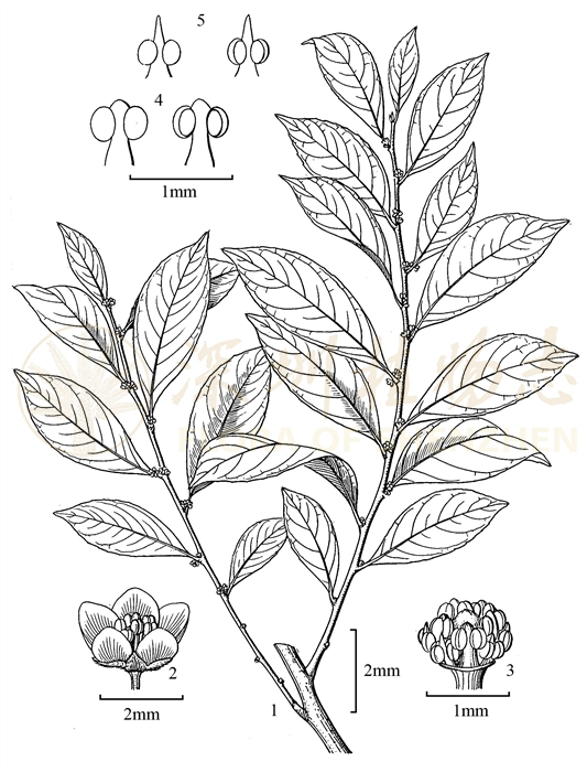 灌木或小乔木,高3-8m。茎皮粗糙;小枝细长,被柔毛,后变无毛。托叶小,狭三角形,长约1.2mm;叶柄长3-7mm,被短柔毛,后变无毛;叶片纸质或薄革质,长圆形、长圆状披针形或椭圆形,长3.5-16cm,宽1.5-5cm,基部楔形或阔楔形,边缘具细锯齿或近全缘,先端渐尖或尾状渐尖,两面无毛或嫩叶片下面中脉被微毛,侧脉每边4-6条。花小,黄色,簇生于叶腋。雄花:花梗长2-3mm,被疏柔毛;萼片三角形,长约1mm,外面被柔毛;花瓣椭圆形,长1.5-2mm,两面均被柔毛;雄蕊10枚,2轮,外轮5枚较长,花丝扁平,药隔三角形,顶端尾状渐尖,突出于药室之外,内轮5枚则退化成肉质退化雄蕊;雌花:花萼和花瓣同雄花,但略长于雄花;子房球形,2室,无毛;花柱2,顶端2裂。核果球形,直径约5mm,成熟时红色,具宿存花萼。种子2个。花期:3-9月。果期:7-11月。