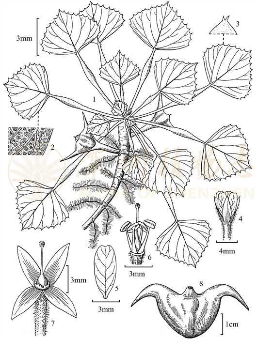 一年生浮水草本。浮水根具多数排列成羽状的纤维根,纤维根呈丝状。茎沉水,粗壮,直径2.5-6mm。浮水叶聚生于茎顶端形成莲座状;叶柄长2-15cm,被短柔毛,中上部膨大呈海绵状气囊;叶片宽菱形,长3-4cm,宽4-5cm,下面绿色或紫色,在脉间有棕色斑块,密被淡黄褐色短柔毛,上面深绿色,光滑,无毛,基部宽楔形至截形,边缘基部全缘,上部具不规则的锯齿,齿顶端有2个小尖齿,先端急尖,有小短尖,侧脉3-5条。花梗长8-9mm,与被丝托均密被长硬毛;被丝托杯状,长约2mm;萼片4,长圆状披针形,长4-5mm,先端急尖,其中一对背面被长硬毛,另一对无毛;花瓣白色,膜质,长圆形,长约5mm,先端微凹;雄蕊4,与花瓣近等长;花盘环状,先端不规则浅裂呈鸡冠状;子房无毛,花柱伸出花冠之外,柱头表面密被疣状突起。果梗粗壮,长1.5-2.5cm,直径3-5mm;果陀螺形至宽菱形,幼时紫红色,成熟后紫黑色,长1.8-3cm,宽2-4.5cm,顶端具喙,喙四方形、圆形或圆锥形,高1-8mm,喙先端具短尖或簇生的毛,少无喙,果腰位置有厚或薄的丘状突起,具2-4个角或无角,角平直、上举或下弯,长2.5-3cm,先端有或无倒刺。种子元宝形,白色,子叶富含淀粉。花期:5-7月。果期:7-9月。